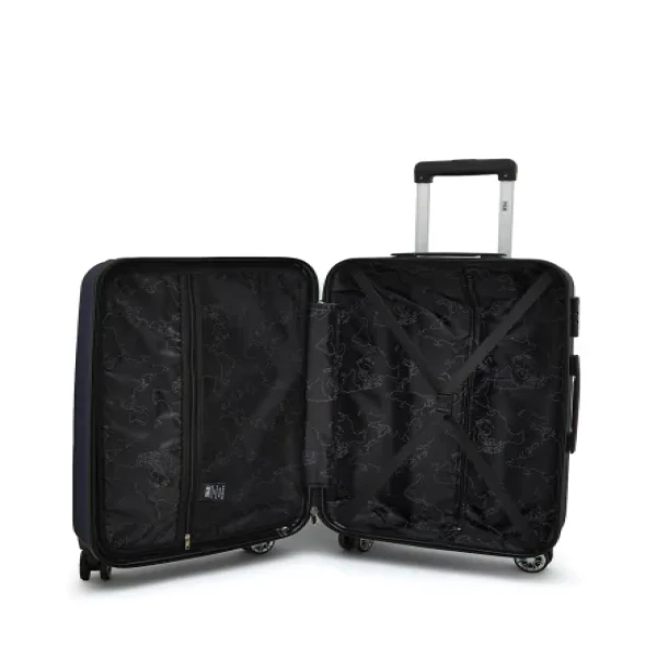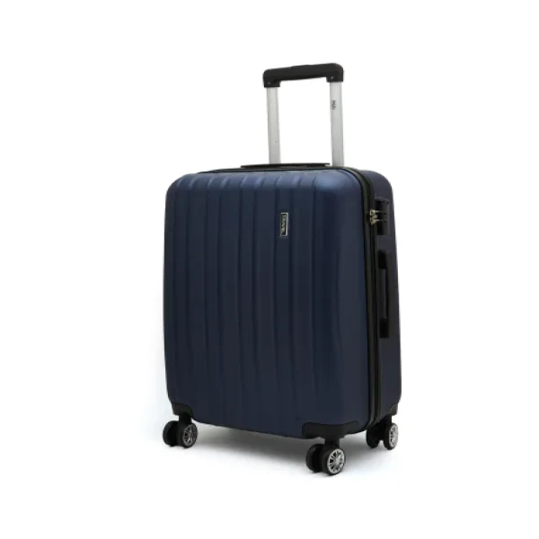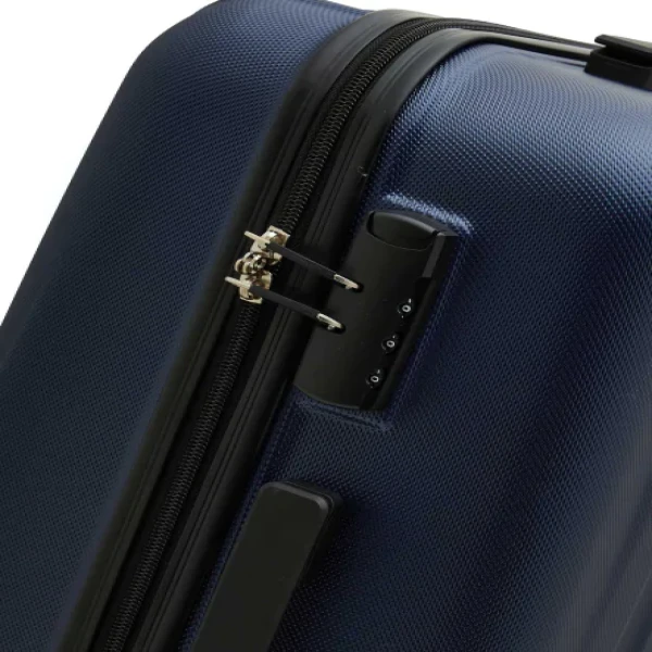 Carry all your belongings in style and with ease in this navy blue textured trolley suitcase for your next vacation. This hard case features a hard body with a retractable handle, side lock and four wheels that will make it easy to move around.