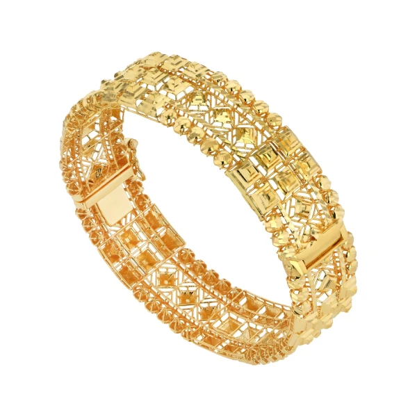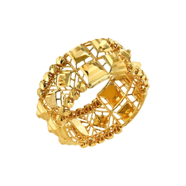A 21K gold set consists of a bangle bracelet and a bold ring which are decorated with diamond-shaped laser cut and round-shaped gold pieces. The 21K gold set has an angel shape design and is decorated with round gold pieces. This 21K gold set weighs approximately 22.23g. The ring size range between 49 to 70 so measure your finger before purchasing.