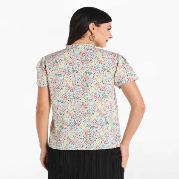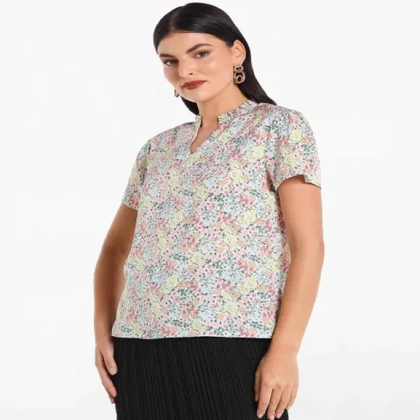 Printed Woven Top with Slit V-Neck and Short Sleeve