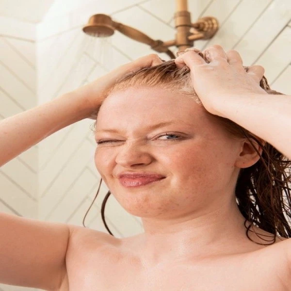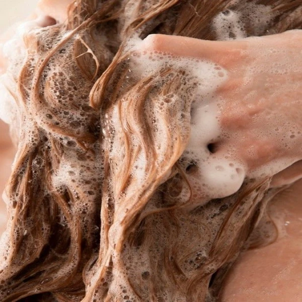 2. Gently massage in a walnut sized dollop of shampoo.