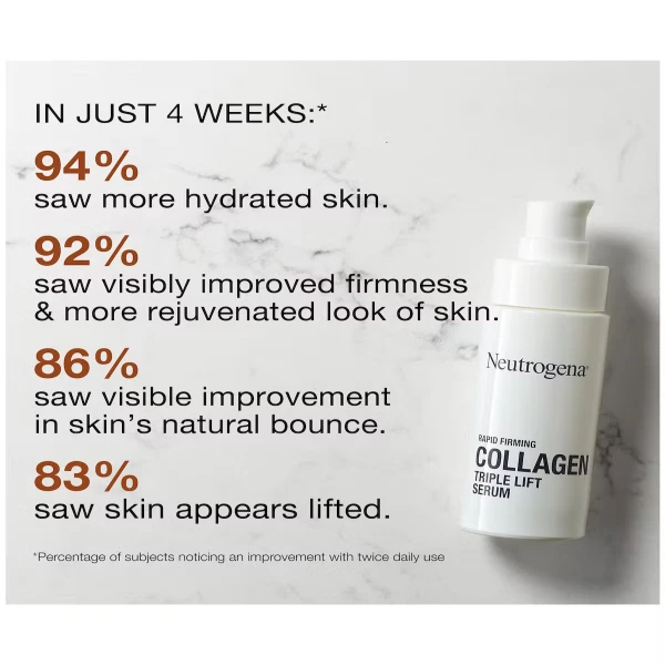 Neutrogena Rapid Firming™ Collagen Triple Lift Face Serum hydrates, smooths and visibly firms skin to restore a contoured-looking and youthful appearance. This daily face serum delivers within skin's surface to smooth and reveal a lifted look, and visibly firmer and more contoured skin over time. Its triple action collagen formula combines pure low molecular weight collagen with AHP amino acids and an amino sugar to complement skin’s natural firming support and restore skin’s taut, youthful appearance.