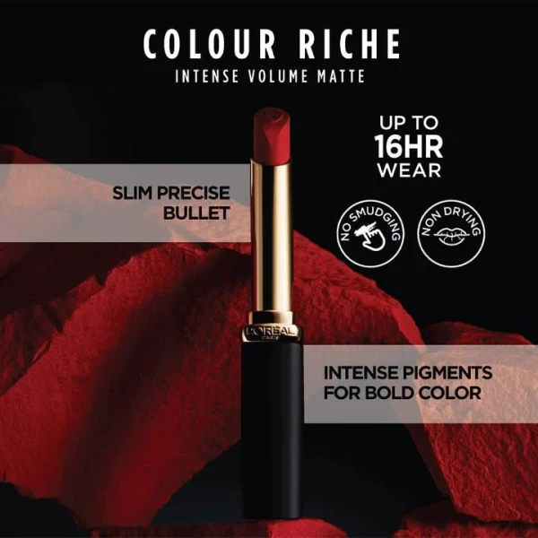 Colour Riche Intense Volume Matte Lipstick is equipped with a slim bullet for precise application to fill your lips with intense color. The formula is infused with hyaluronic acid for fuller, softer and healthier lips with each swipe.