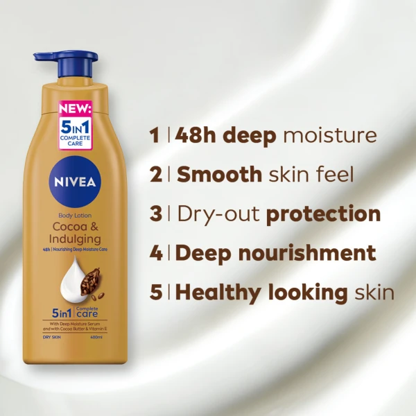 The NIVEA Cocoa & Indulging Body Lotion Moisturiser with Cocoa Butter and Vitamin E has a unique composition of skin’s own moisturiser, moisture-locking lipids and care providing oils that work together to bind and hold water in the skin. This then means that the moisture cannot evaporate easily into the surrounding areas. Skin is well protected from drying out, because water loss is reduced and the moisture level of the skin is increased. The latest testing methods have shown that the perfect combination of high quality ingredients of our NIVEA body lotions together with the NIVEA DEEP MOISTURE SERUM penetrates deeply into the skin, locking moisture and providing deep* moisture for 48h.*upper layer of the epidermis.