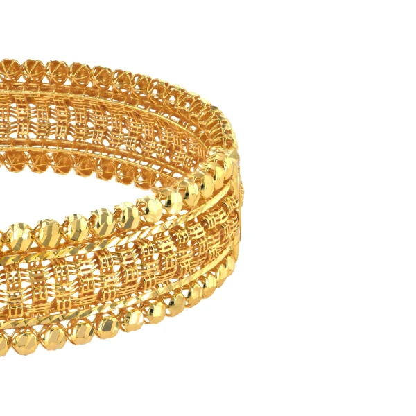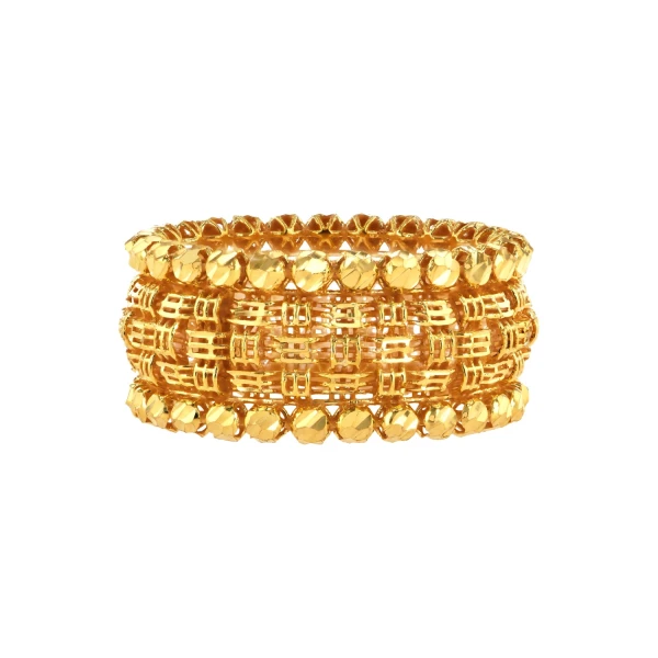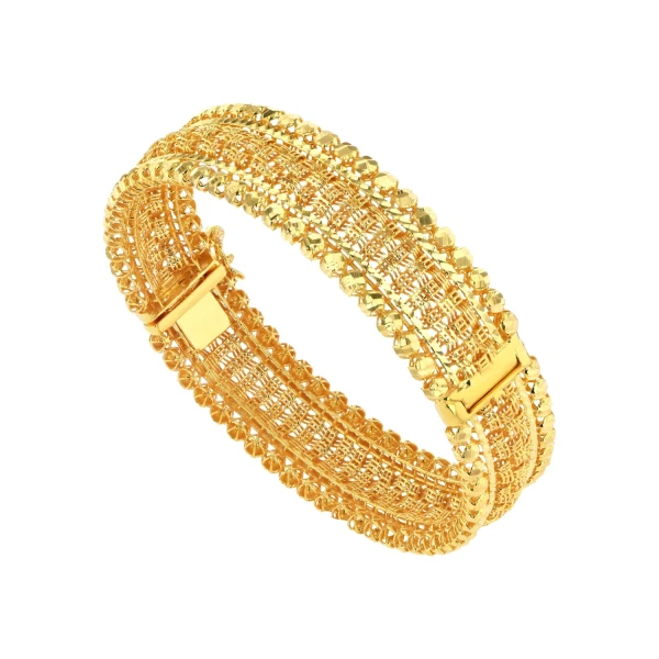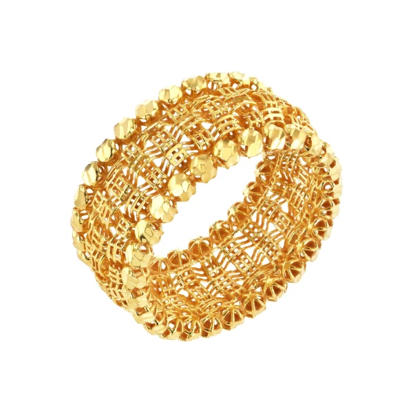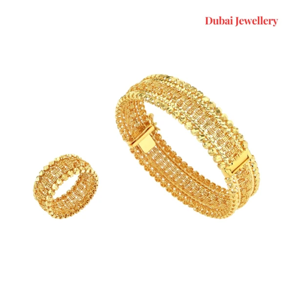 A 21K gold set consists of a bangle bracelet and a bold ring which are decorated with laser cut gold design and round-shaped gold pieces. The 21K gold set has an angel shape design and is decorated with round gold pieces. This 21K gold set weighs approximately 27.24g. The ring size range between 49 to 70 so measure your finger before purchasing.