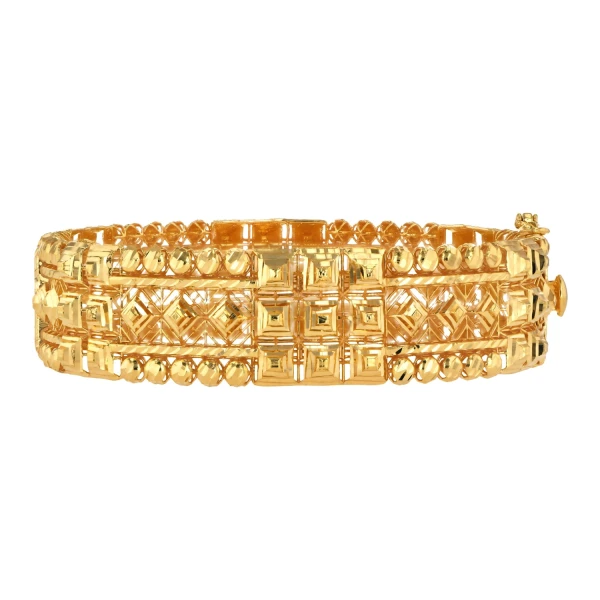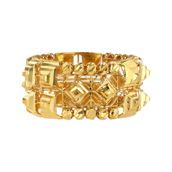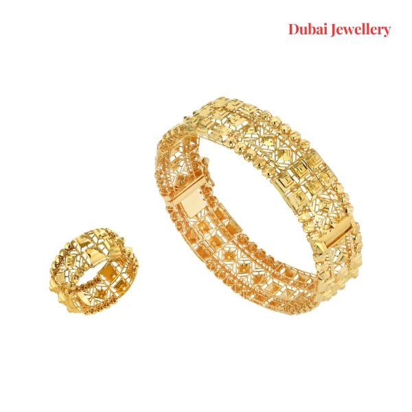 A 21K gold set consists of a bangle bracelet and a bold ring which are decorated with diamond-shaped laser cut and round-shaped gold pieces. The 21K gold set has an angel shape design and is decorated with round gold pieces. This 21K gold set weighs approximately 22.23g. The ring size range between 49 to 70 so measure your finger before purchasing.