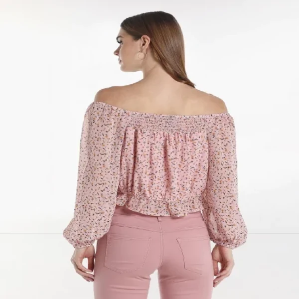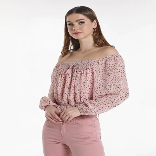 Printed Off Shoulder Woven Top With Long Sleeves