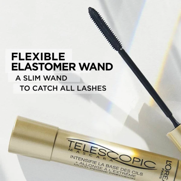 Telescopic® Original Mascara enhances your lashes with intense length and unique lash by lash separation. The flat side of the patented flexible Precision Brush lengthens lashes up to 60%, while the comb side of the brush precisely separates lashes for a clump-free result. Fragrance-free. Ophthalmologist-tested and allergy-tested. Suitable for sensitive eyes and contact lens wearers.